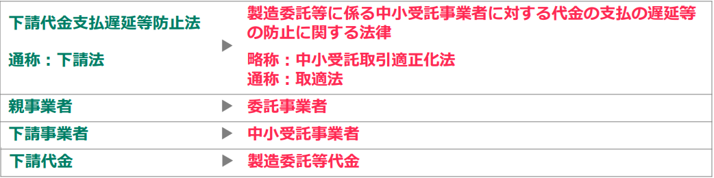 改正下請法の施行日(2026年1月1日)まで3か月を切った。改正法では、規制内容の追加や規制対象の拡大が行われるとともに、法律名も「製造委託等に係る中小受託事業者に対する代金の支払の遅延等の防止に関する法律」に変更されている(新通称は「取適法(とりてきほう)」)。用語の主な変更箇所については下図(公取の改正ポイント説明会資料5ページから抜粋)を参照)。