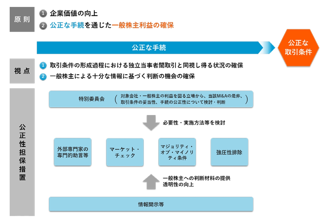ファミリーマートは公正性担保措置を講じた。具体的には、取締役会は特別委員会を設置し、特別委員会に対して①ファミリーマートの企業価値の向上に資するかという観点から、非公開化取引の是非について検討・判断するとともに、②ファミリーマートの一般株主の利益を図る観点から、取引条件の妥当性及び手続の公正性について検討・判断した上で、③TOBについて取締役会が賛同するべきか否か、及び、ファミリーマートの株主に対してTOBへの応募を推奨するべきか否かを検討し、取締役会に勧告を行うこと、④取締役会における非公開化取引についての決定が、ファミリーマートの尐数株主にとって不利益なものでないかを検討して取締役会に意見を述べることを諮問し、その意見をファミリーマートに提出することを委嘱した。
