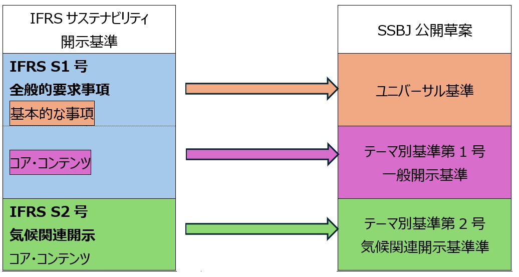 A1:NO SSBJ(サステナビリティ基準委員会)は、高品質で国際的に整合性のあるサステナビリティ開示基準を開発するためには、グローバル・ベースラインとされるISSB(国際サステナビリティ審議会)が作成しているIFRSサステナビリティ開示基準(以下、適宜「ISSB基準」という)との整合性が必要であると考え、公開草案はISSB基準(IFRS S1号「サステナビリティ関連財務情報の開示に関する全般的要求事項」及びIFRS S2号「気候関連開示」)をベースに作られています。 |