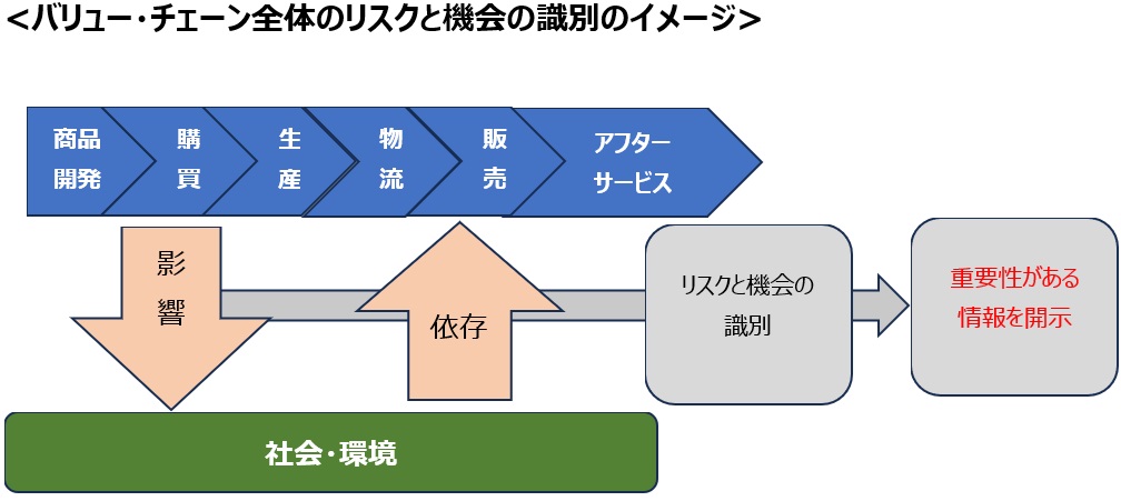 A9:NO サステナビリティ関連のリスク及び機会は、企業と、当該企業のバリュー・チェーンを通じた企業の利害関係者、社会、経済及び自然環境との間の相互作用から生じると考えられるため、連結グループの外のバリュー・チェーンも考慮する必要があります。 具体的には、企業はキャッシュ・フローを生み出すためにバリュー・チェーンを通じて資源及び種々の関係に依存し、それらの資源及び関係を利用して行われる企業の活動や活動の結果として生じるアウトプットが、企業が依存する資源及び関係に影響(それらの資源及び関係の維持、再生及び発展又は劣化及び枯渇等)を与えることにより、サステナビリティ関連のリスク及び機会が生じます。 |