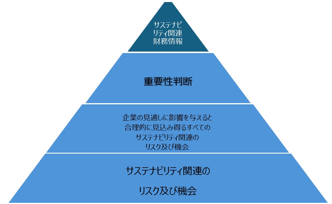 サステナビリティ関連財務開示 : 企業の見通しに影響を与えると合理的に見込み得る、報告企業のサステナビリティ関連のリスク及び機会に関する情報(それらのリスク及び機会に関連する企業のガバナンス、戦略及びリスク管理並びに関連する指標及び目標に関する情報を含む)を開示すること。サステナビリティ関連財務開示は、一般目的財務報告書の一様式として提供される。