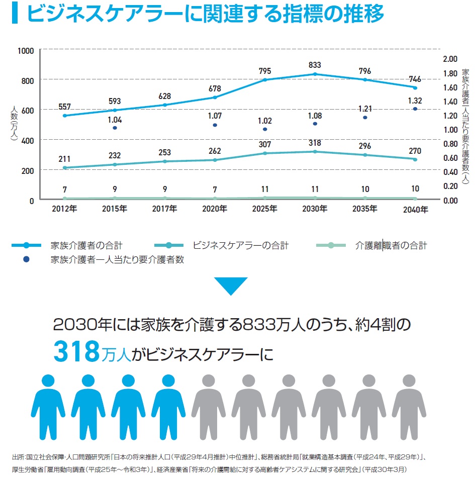 介護を理由に離職する従業員は年間10万人ほど存在すると言われています。離職しないまでも、「ビジネスケアラー」(働きながら家族などの介護をする人)として、介護と仕事の両立に苦しんでいる従業員も大勢います。厚生労働省の試算によると、2030年には家族を介護する833万人のうち、約4割の318万人がビジネスケアラーになると予測しています(「仕事と介護の両立支援に関する経営者向けガイドライン-入門編-」の3ページより引用)。