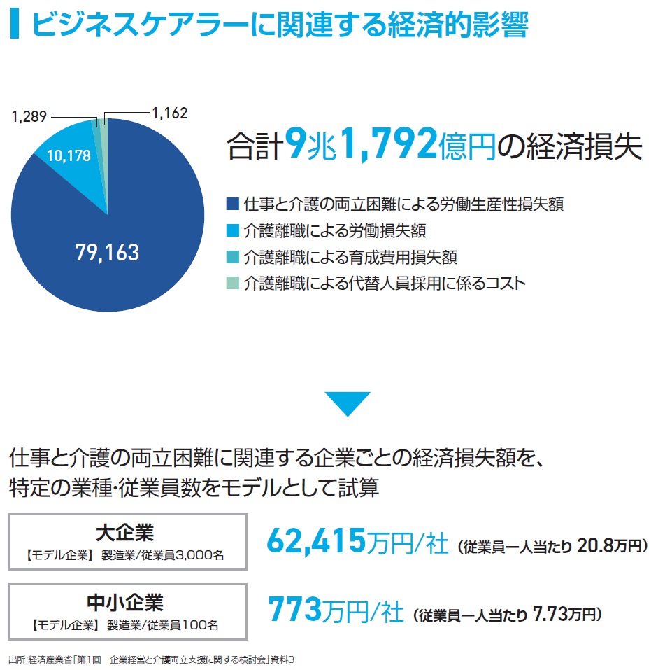また、仕事と介護の両立困難に関連する企業の経済損失額を、従業員3,000名の製造業をモデルとして試算したところ、1社あたりの損失が6億2415万円になることも分かりました(「仕事と介護の両立支援に関する経営者向けガイドライン-入門編-」の3ページより引用)。