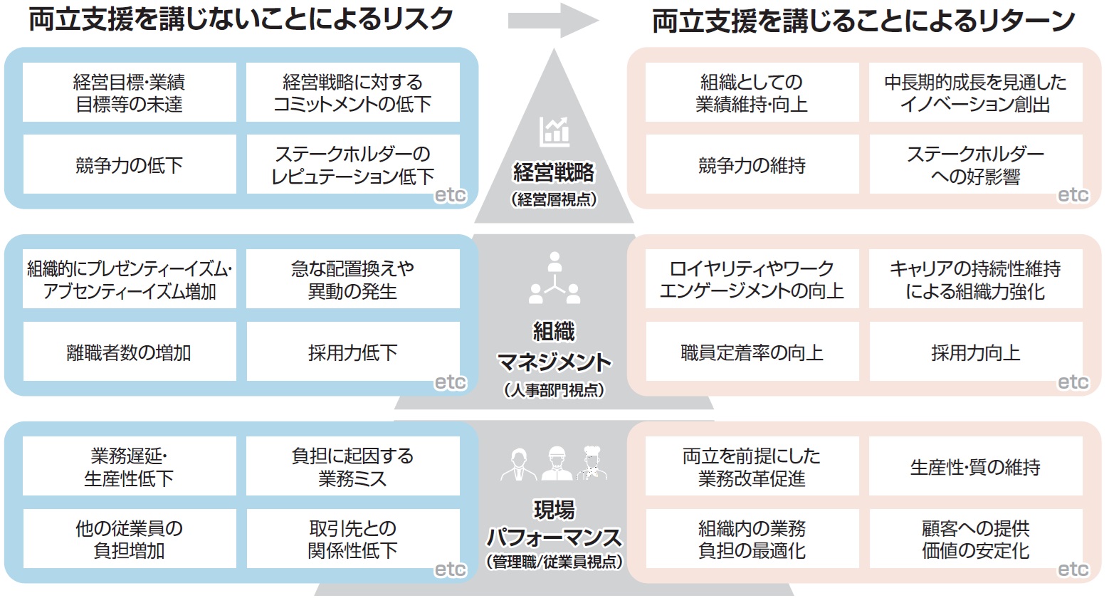 厚生労働省は、それぞれの企業が、「自社における仕事と介護の両立支援の意義や重要性が可視化」できるように、「仕事と介護の両立支援が与える自社への影響を整理・分析すること」を勧めています(仕事と介護の両立支援に関する経営者向けガイドライン-入門編-5ページより引用)。