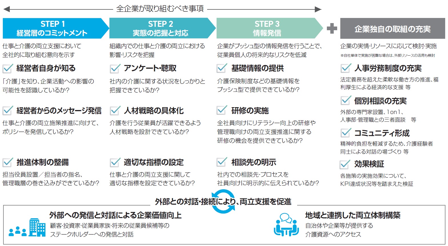 介護両立支援のアクションの詳細については、「仕事と介護の両立支援に関する経営者向けガイドライン」や厚生労働省の特設サイト「仕事と介護の両立~介護離職を防ぐために~」を参考にしてください。