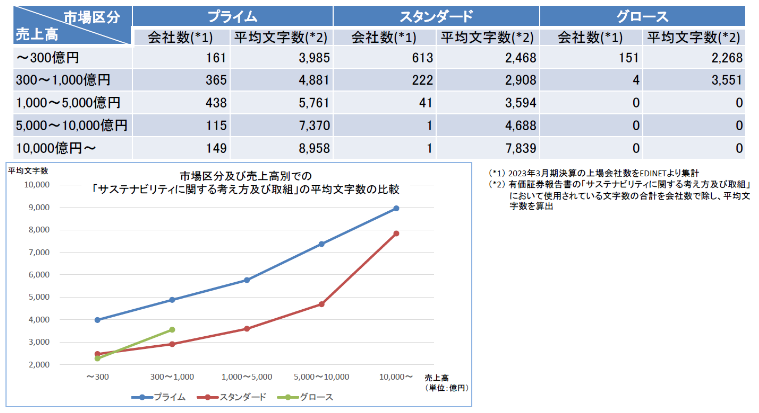 同じく「記述情報の開示の好事例集 2023」で新たに加わった「【参考】定量分析」の参考2のサステナビリティ開示の売上別平均文字数の分析結果にも目を通しておきたい。これは、2023年3月期決算の上場企業の有価証券報告書の記載項目のうち、サステナビリティ開示で使用されている文字数を売上高の区分(5段階)ごと、かつ、市場区分ごとに平均した結果を取りまとめたもの(下表参照)。それによると、売上高が増えれば増えるほど、また、同じ売上高区分であればスタンダード市場上場企業よりはプライム市場上場企業の方がサステナビリティ開示の平均文字数も増えることが実証されている。