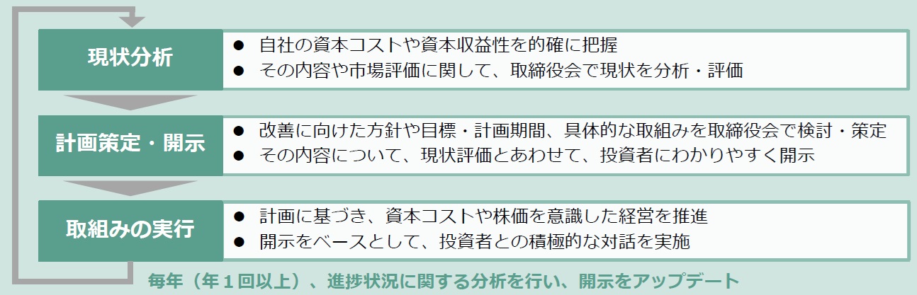 周知のとおり、東京証券取引所は2023年3月にプライム市場及びスタンダード市場に上場している会社に「資本コストや株価を意識した経営の実現に向けた対応」を要請しました。これは、資本コストや株価を意識した経営の実現に向けて、以下の一連の対応の継続的な実施を求めるものです(詳細については2023年4月5日のニュース『「資本コストや株価を意識した経営の実現に向けた対応」における要請事項と開示時期』を参照)。