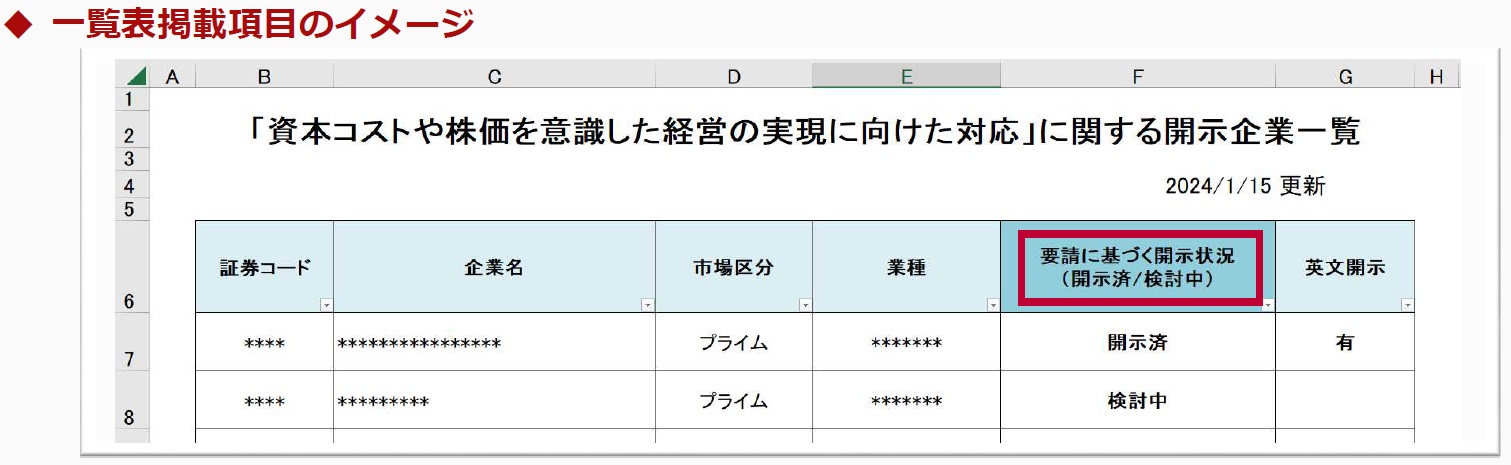 本リリースによると、開示企業一覧表の掲載項目は次のようなイメージとされており、表計算用のファイルで開示されるものと予想されます。