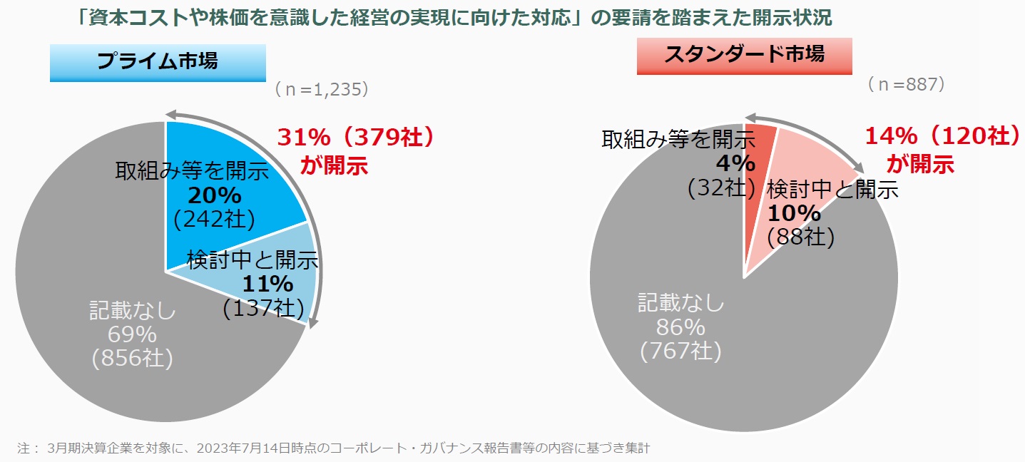 もっとも、プライム市場及びスタンダード市場に上場している会社のCG報告書での開示はなかなか浸透していないことが指摘されています。実際に、東証が3月期決算企業を対象に、2023年7月14日時点のCG報告書等の内容に基づき集計「資本コストや株価を意識した経営の実現に向けた対応」の要請を踏まえた開示状況を調査したところ、次のように低調であることが分かりました(東証の市場区分の見直しに関するフォローアップ会議 第11回(2023年8月29日開催)東証説明資料3の1ページ目を参照)。