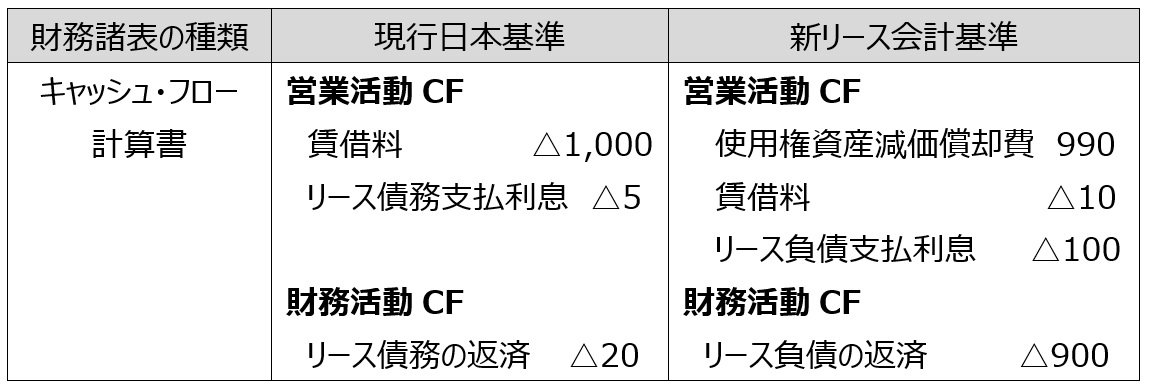 新リース会計基準のもとでは、現行基準では営業活動によるキャッシュ・フローとされているオペレーティング・リースの支払額(賃借料)が、基本的に財務活動によるキャッシュ・フローのリース負債の返済額に置き換わることとなり、営業活動によるキャッシュ・フローが改善する。その一方で、財務活動によるキャッシュ・フローは悪化する。