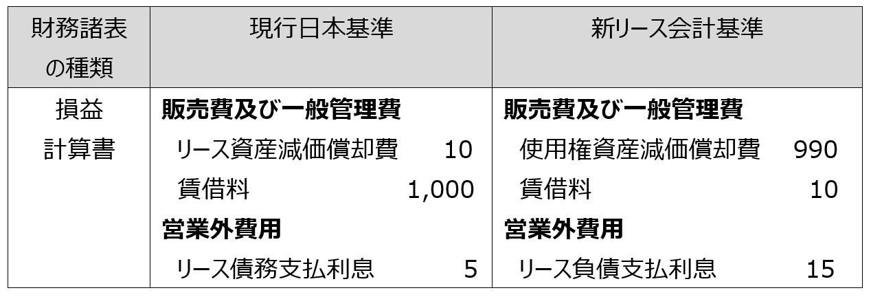 現行基準では、オペレーティング・リースの賃借料は毎月定額計上するが、新リース会計基準では、賃借料こそ大きく減少するものの、使用権資産減価償却費およびリース負債支払利息が発生する。そして、使用権資産の減価償却は定額であり、リース負債支払利息はリース契約当初は多く発生するがリース期間を通じて逓減していくことになる。この結果、オペレーティング・リースとして会計処理してる現行基準と比べて、リース契約当初は費用負担額が多くなる。