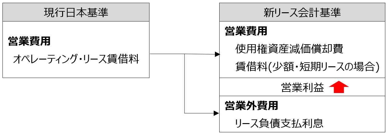 現行基準では営業費用とされていた賃借料に相当する金額の一部が、新リース会計基準ではリース負債支払利息として「営業外費用」に計上されることにため、営業利益が改善する。