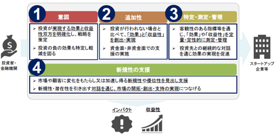 報告書案では、インパクト投資が「社会・環境的効果」と「収益」の双方を実現していくための要件として、①意図、②追加性、③特定・測定・管理、④新規性の支援、の4つを挙げている(16ページ~「(3)インパクト投資に必要な要件」および下図参照)、国際的に用いられているインパクト投資の定義と比較すると、「追加性」や「新規性の支援」は独特と言える。インパクト投資等に関する検討会では、「インパクト投資によって『社会・環境的効果』に加え『収益性』を創出するというのは難しいのではないか」という意見が出るなど、収益性の取扱いが議論となった。報告書案は、今後パブリックコメントを経て、今年の秋頃にファイナライズされる。