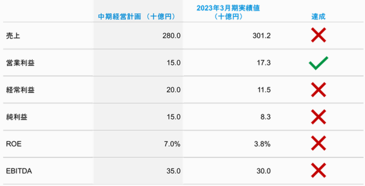 オアシスの「北越コーポレーションの2022年度の売上は中期経営計画の連結経営目標を達成していない」との主張は、北越コーポレーション取締役会も指摘しているとおり事実誤認であり、オアシス作成の資料(下記)で売上高の「達成」にバツ印を付けているのは明白な間違いである(本来は緑色のチェックマークが付されるべきであった)。こういった基本的なところで事実誤認があると、投資家に「慎重な検討が行われていないのではないか」「印象操作を図ったのではないか」との疑念を抱かせてしまい、キャンペーン自体の信頼性も揺らぎかねない。
