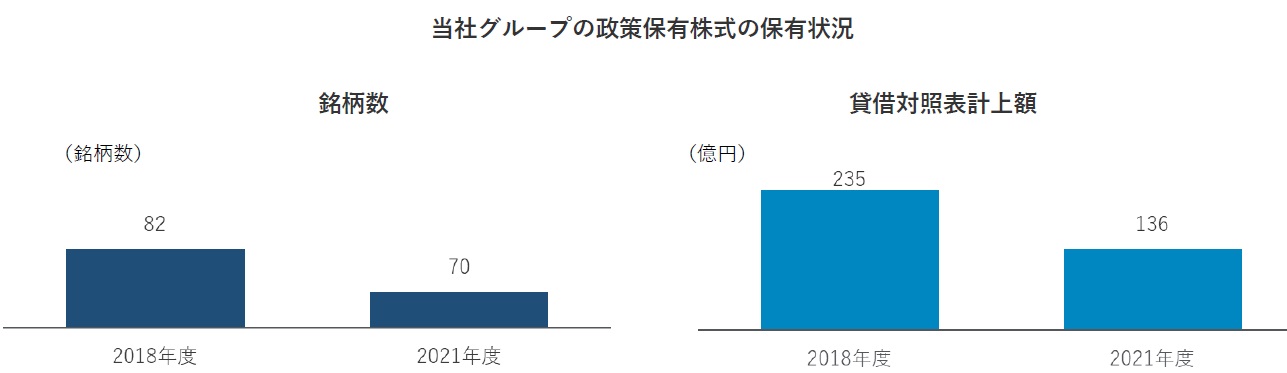 一方、北越コーポレーションの取締役会も、「オアシスのプレゼンテーションに対する当社取締役会の見解補足説明資料」8ページにおいて、実際には政策保有株式が2018年度の82銘柄から2021年度には70に減っただけであるにもかかわらず、あたかも半減したかのようなグラフを掲げている(下グラフの左側参照)。このようなグラフは一般に“詐欺グラフ”と称されるように、読み手の印象を操作する意図を持った不誠実なデザインと言わざるを得ない。
