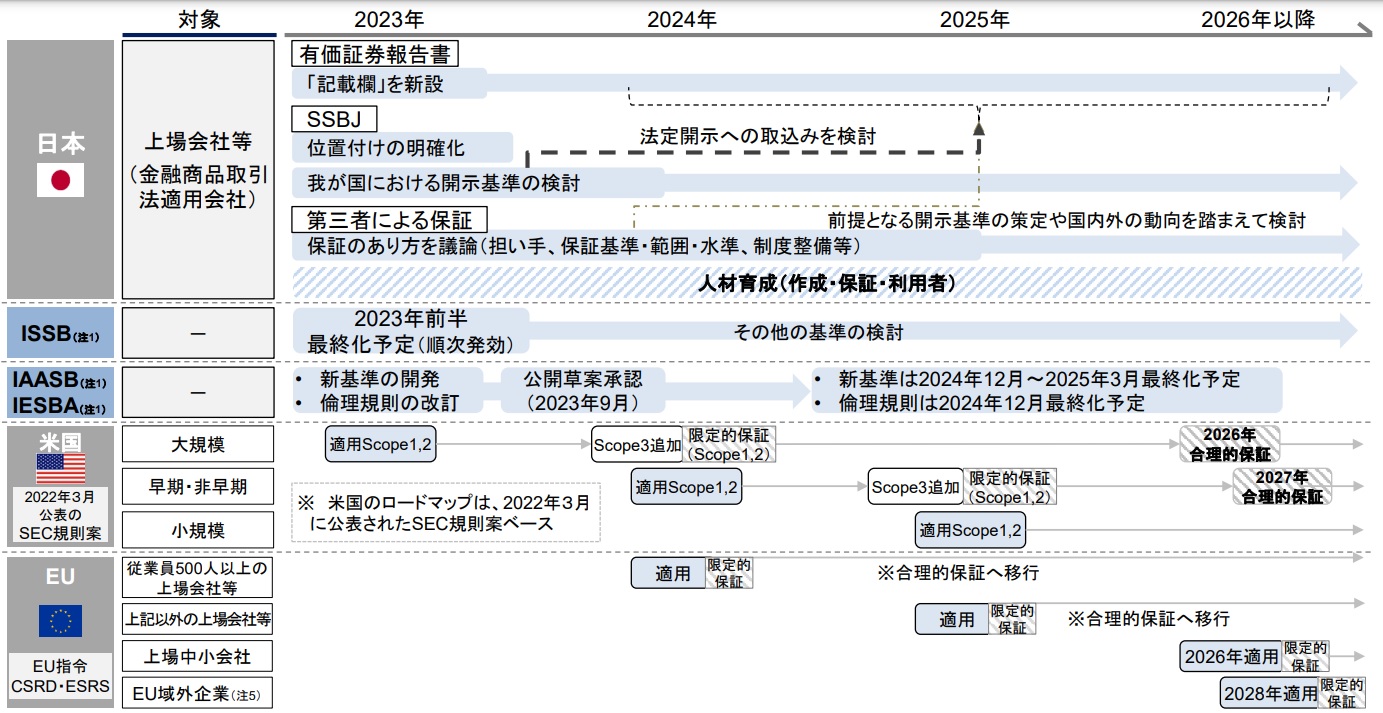 日本のSSBJによるサステナビリティ開示基準開発のロードマップは下図のとおり。ISSBのみならず、米国やEUにおける基準開発、適用動向を踏まえたものとなっている。
