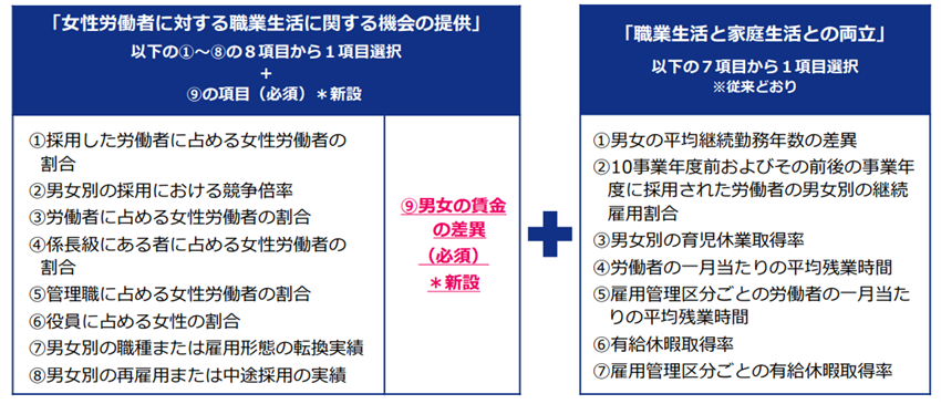 まず、常時雇用する労働者が101人以上300人以下の事業主は、下記16項目から任意の1項目以上の情報公表が必要になる(下記⑨の開示が必須となるのは「労働者が301人以上の事業主」に限られる。厚生労働省のパンフレット参照)。