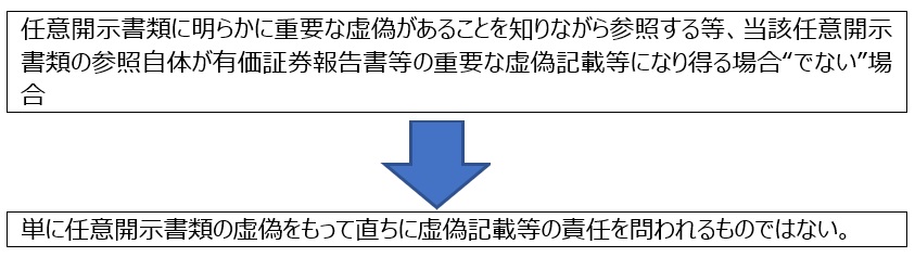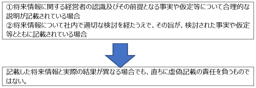 サステナビリティ情報には多くの将来情報が含まれます。また、サステナビリティ情報や取締役会等の活動状況(後記4(1)参照)の記載においては、任意開示書類を参照することが想定されています。そこで、「企業内容等の開示に関する留意事項について」(開示ガイドライン)の改正案では、サステナビリティ情報をはじめとした将来情報について将来結果が異なった場合、及び参照先の任意開示書類に虚偽記載があった場合の取扱いが明確化されています(5-16-2、5-16-4)。