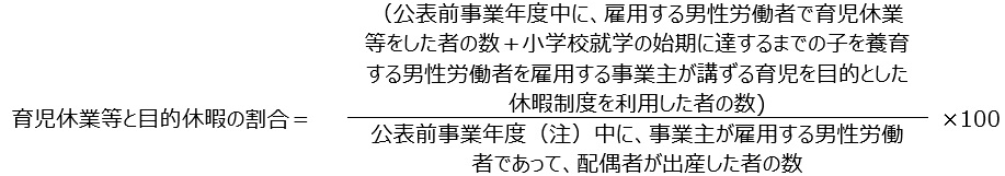 (注)上記①②の算式は、育児休業、介護休業等育児又は家族介護を行う労働者の福祉に関する法律で示されているもので、常時雇用する労働者が1,000人を超える事業主は、育児休業等の取得の状況(算定式①又は②による割合)を2023年4月1日以降、年1回公表することが義務付けられる。