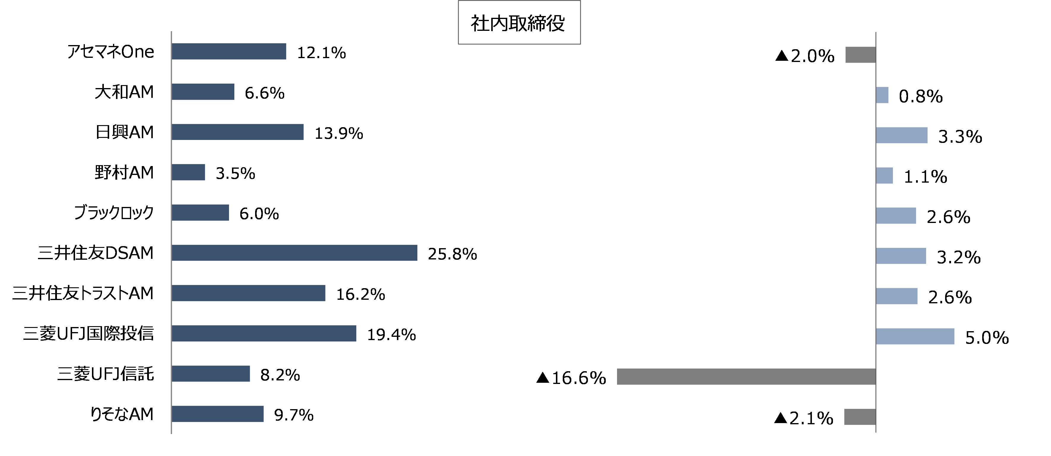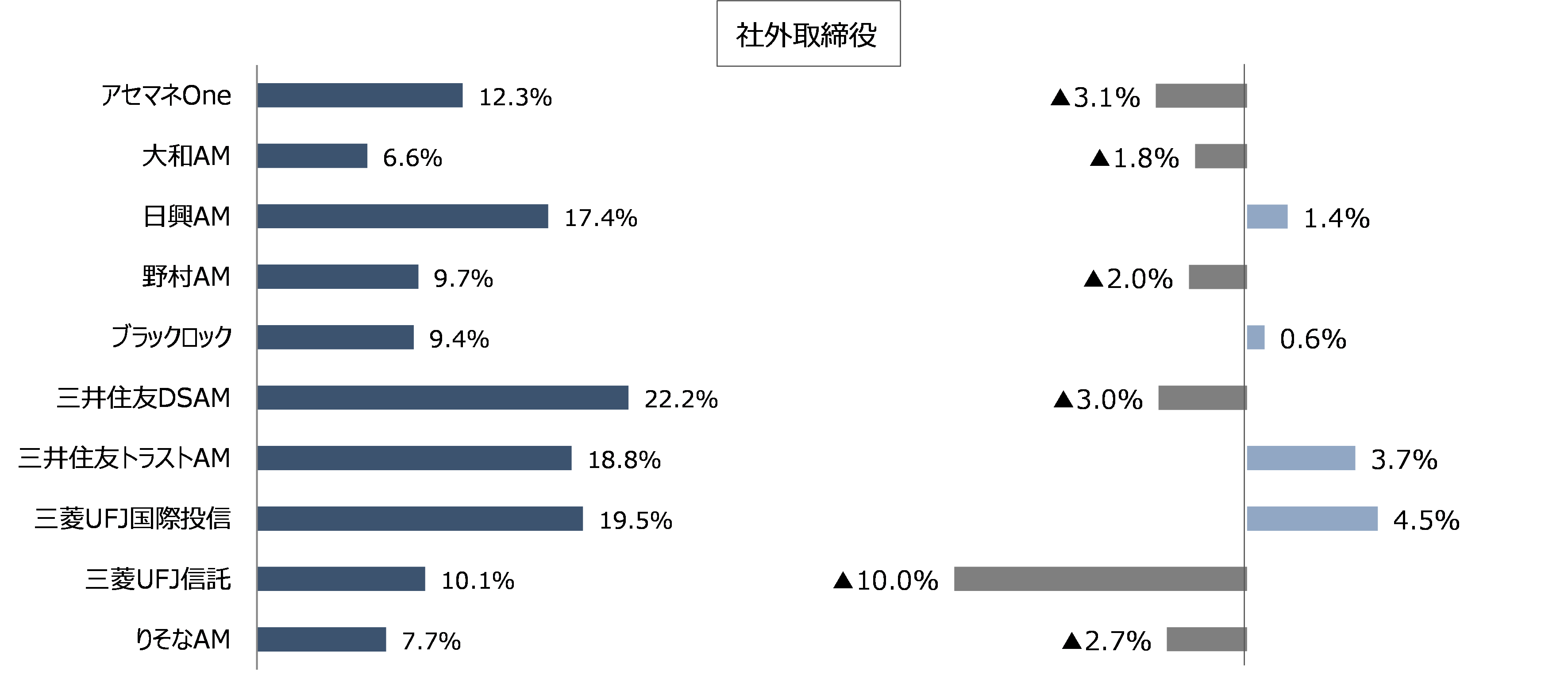 三井住友DSアセットマネジメントに次いで反対率が高く、かつ前年比で反対率の増加が最も大きかったのが三菱UFJ国際投信です。これには、同社が本年2月に行った議決権行使基準の改定が影響していると考えられます。具具体的な改定内容は、例えばプライム市場に上場する親会社等のない監査役会設置会社の場合、従来「社外取締役2名未満の場合に反対」とされていたものが、「独立性のある社外取締役が1/3未満の場合に反対」へと厳格化されています。反対の対象が全取締役であることもあり、社内取締役選任議案、社外取締役選任議案ともに反対率が高くなっています。