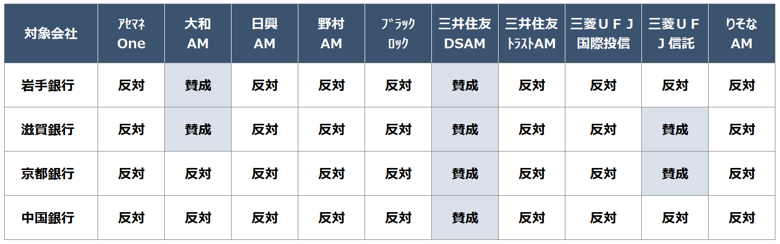 一方、三菱UFJ信託銀行は、岩手銀行と中国銀行への提案について「同社の株主還元方針に特段問題がない」として反対したのに対し、滋賀銀行と京都銀行の議案については「株主提案の配当を実施しても、財務の健全性上問題はなく、資本の効率性は高まるものと考える」として賛成しています。各行の財務状況などを個別に精査したうえでの判断であることがうかがえますが、特に政策保有株式の保有状況などが重視された可能性もあると考えられます。