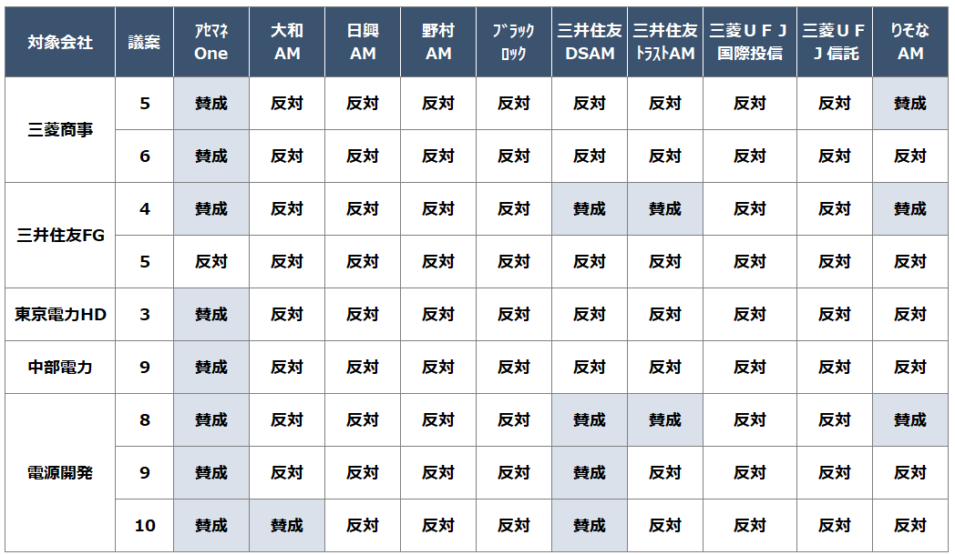 同社が唯一反対したのが、三井住友フィナンシャルグループの第5号議案です。この議案は同社の貸付等が新規の化石燃料供給等に用いられないようにすることなどを求めるものであり、単に開示を求めるという範疇を超えて、業務執行を制約する提案と判断された可能性があると考えられます。
