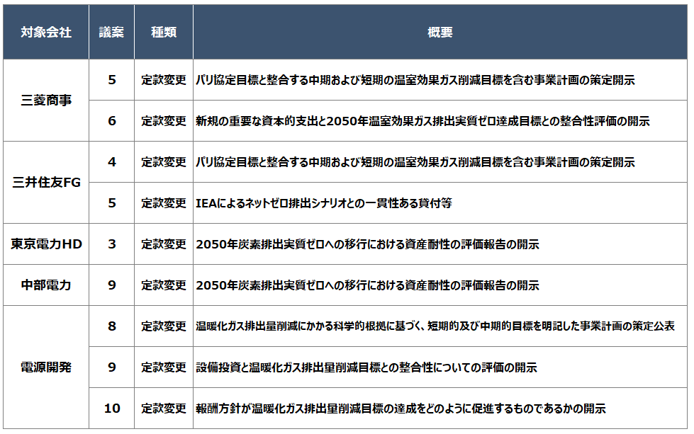 本年も気候変動関連の株主提案が注目されました。主な提案の内容と、これに対する主要国内機関投資家の行使判断は図表3、4のとおりです。