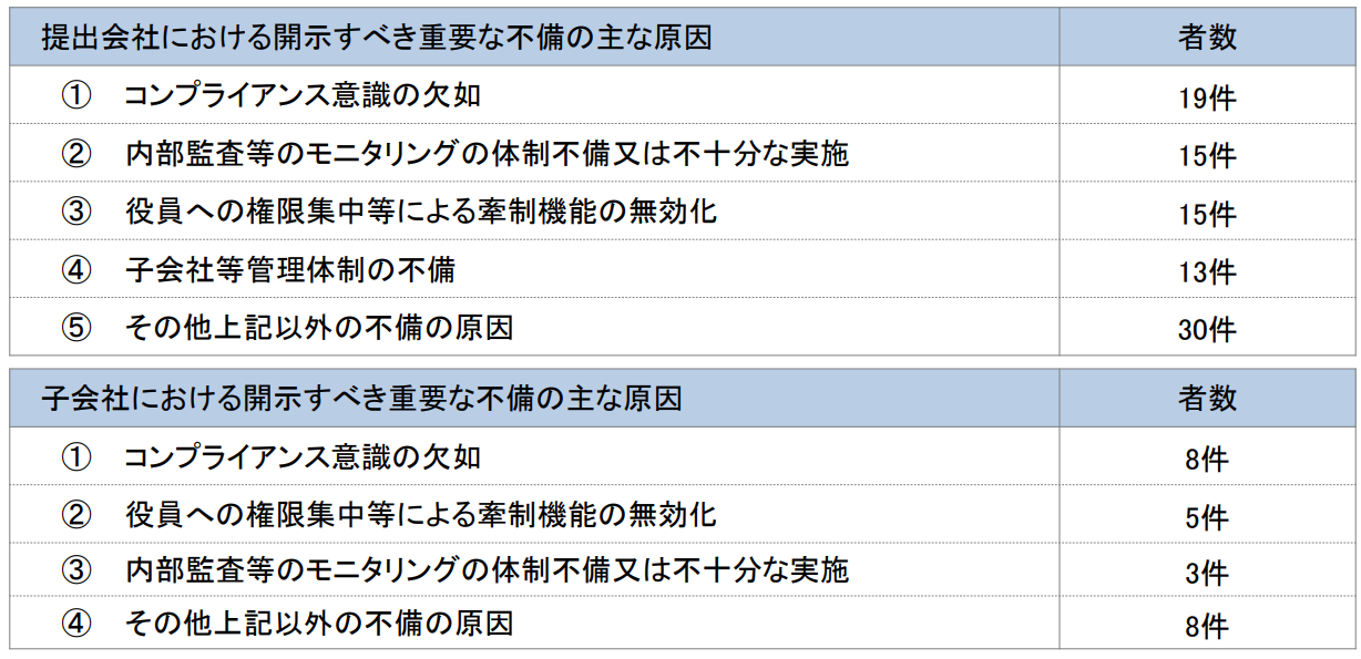 2008年4月以降の事業年度から適用されている内部統制報告制度(J-SOX)の導入から10余年が経過したが、同制度は企業の経営管理・ガバナンスの向上に一定の効果をもたらしたものの、その実効性には懸念があるとの指摘が聞かれる。金融庁の調査によると、近年「内部統制が有効でなかった」とされた事例では、コンプライアンス意識の欠如、モニタリング体制の不備、牽制機能の無効化、子会社等の管理体制の不備などが原因となっている。
