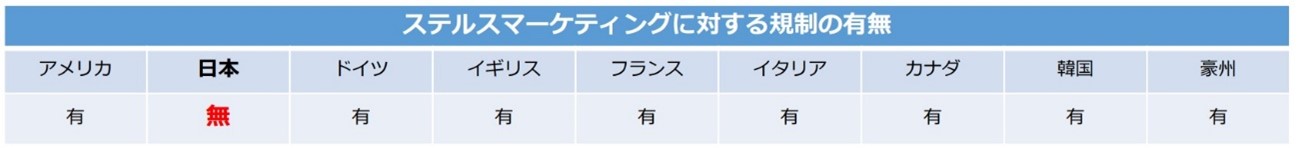 日本にはステルスマーケティングに対して、業界団体や媒体運営会社における自主規制は存在しているが、法律による規制は存在しない。OECD加盟国(名目GDP上位9か国)において、ステルスマーケティングに対する法規制がないのは日本のみであり(下表は消費者庁ステルスマーケティングに関する検討会の第1回会合の資料4「ステルスマーケティングに関する実態調査」5ページより引用)、まさに日本は広告主にとって“ステマ天国”と言える。