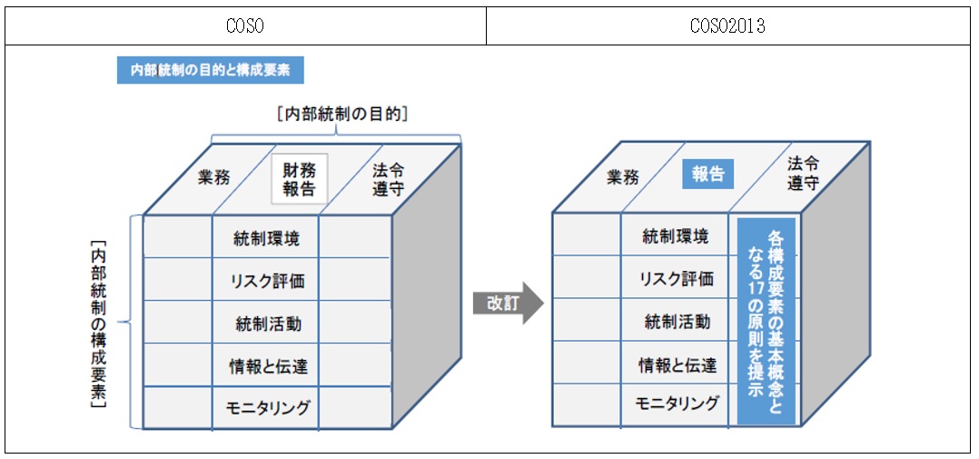 もともと、日本の内部統制報告制度は米国COSO(Committee of Sponsoring Organizations of the Treadway Commission=通称:トレッドウェイ委員会支援組織委員会)が1992年に公表した統合的フレームワークをベースに作られたが、当該フレームワークは2013年に改定され、「COSO2013」となった。改定の主なポイントは以下のとおりだ。