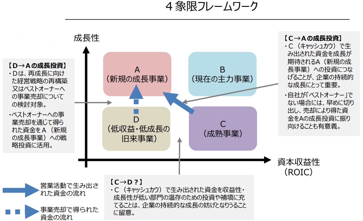 事業ポートフォリオを定期的に見直す仕組みとして有効なのが、事業セグメントごとのROIC(投下資本収益性)を利用した4象限フレームワークによる分析です(下図は「事業再編実務指針」の42ページより引用)