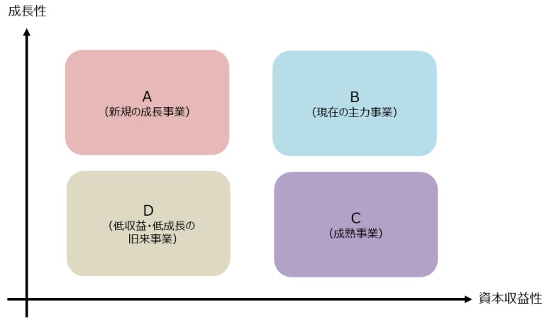 縦軸に事業セグメントごとの成長性、横軸に事業セグメントごとのROICをとると、それぞれの高低で4つの象限に分けることができます(上図のA~D)。