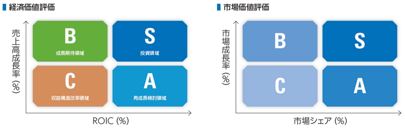 4象限フレームワークの縦軸と横軸を入れ替えれば、様々な事業ポートフォリオの分析が可能になります。例えばオムロンでは、縦軸を売上高成長率、横軸をROICとした「経済価値評価」を行うだけでなく、縦軸を市場成長率、横軸を市場シェアとした「市場価値評価」も行っています。