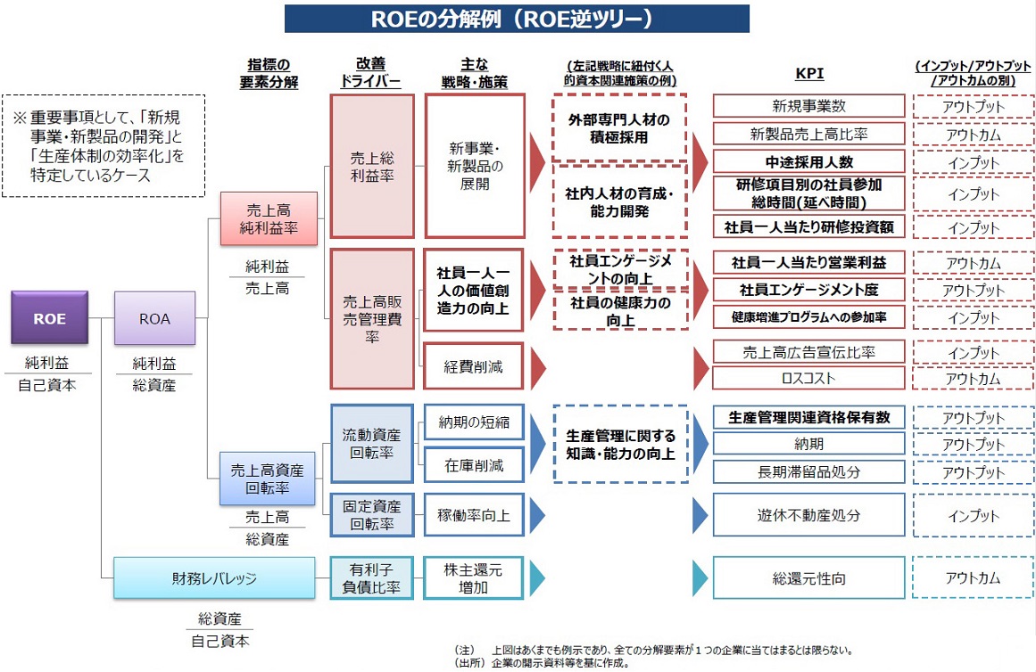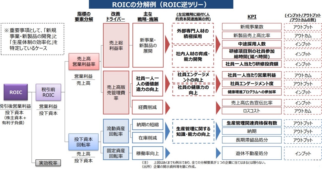 上記(ⅰ)については、会社によって名称や内容の違いはあるにせよ何らかの「方針」はあるのが通常であるため、それをメンテナンスすることで対応できるケースが多いだろう。また(ⅲ)も、算定した値が業界平均を下回ることになれば採用活動や企業イメージの点で他社の後塵を拝しかねないというリスクはあるものの、会社にとっての負担という点では、算定した値を開示するだけの話に過ぎない。これに対し(ⅱ)は、「方針」と整合的で測定可能な指標(インプット、アウトカム等)の設定が必要となることから、こういった指標をKPIとして採用していない会社では、人材関連の多数の指標の中から自社に適したものを選定するのに手間取ることが予想される。こうした会社にとっては、内閣官房に設置された非財務情報可視化研究会がとりまとめた「人的資本可視化指針(案)」(2022年6月29日から7月29日までパブリックコメントを募集)が参考になるだろう。これは、資本市場に向けた人的資本に関する情報開⽰のあり⽅に焦点を当て、会社の対応の⽅向性を包括的に整理した⼿引きであり、下記のとおり、ROICやROEといった馴染みのある数式を分解し、人材関連のKPIとしてのインプットとアウトカムを導き出す手法が示されている。ROICやROEをベースに人材関連のKPIを導き出している理由として同指針は、「投資家がROEやROICといった資本効率や収益性を表す指標を重視していることを踏まえれば、例えば自社の人的資本への投資に関する戦略や取組と、ROEやROICなどの指標との関連性を吟味した上で開示事項を検討することは、それ自体人材戦略の検討において有益なアプローチである」ことを挙げている(人的資本可視化指針(案)の36ページ参照)。「方針」と整合的で測定可能な指標(インプット、アウトカム等)の設定に悩む上場会社にとっては参考になろう。