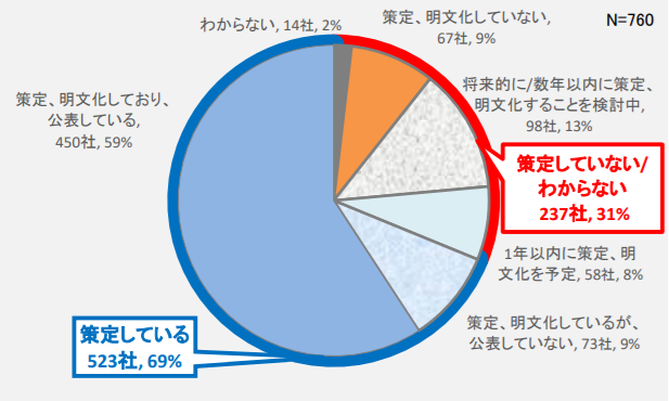2021年12月10日のニュース「上場企業における人権方針と人権デュー・ディリジェンス対応の実態」でお伝えしたとおり、経済産業省と外務省が2021年8月末に東証一部・二部上場企業等2,786社を対象に実施した「日本企業のサプライチェーンにおける人権に関する取組状況のアンケート調査」の集計結果(2021年11月30日公表。以下、アンケート調査結果)によると、回答があった企業760社のうち人権方針を策定している企業は約7割(69%、523社)となっており、残りの約3割の企業が未作成でした(集計結果の3ページ参照)。