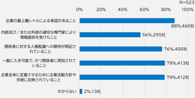 また、人権方針を策定している企業であっても、上記の要件をすべて満たす形で策定できている企業は少ないことも分かりました。