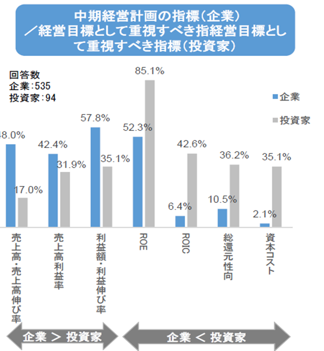 下図からも、投資家がROEやROICといった資本効率に関する指標を重視していることが分かる。株主と目線を合わせるうえでは、業績連動報酬に係る指標としても資本効率性指標を取り入れる必要があろう。仮にPL関連の指標を用いるとしても、売上高、利益の額といった絶対額ではなく、売上高営業利益率 といった収益力を表す指標が望ましいと言える。