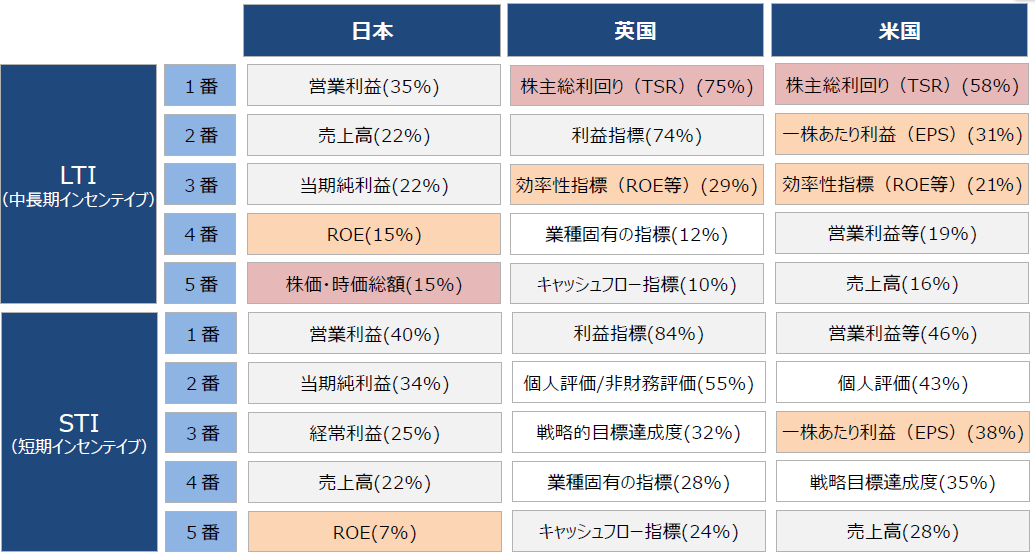 また、当フォーラムによる上記調査結果のとおり、TSRなど株価をベースとした指標を業績連動報酬として採用している会社は22社(28%)と少数にとどまっており、英米企業のLTI(中長期インセンティブ=Long-term incentive)でTSRがトップになっているのとは対照的となっている。