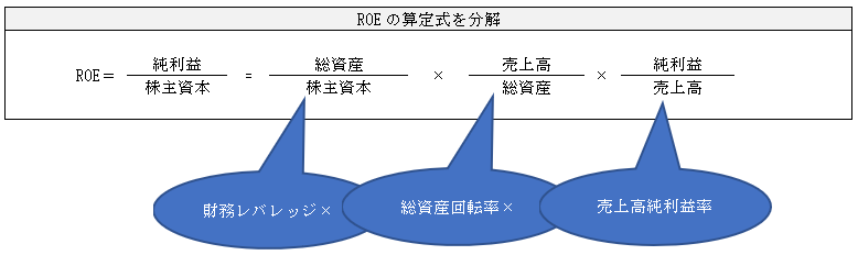 例えば、配当を増額したり、自己株式を購入したりすることで株主資本(分母)を減少させれば、純利益の改善なくしてROEは上昇する。また、上記のROEの算定式を分解すると下記のとおりとなるが、この分解式からも明らかなように、資金調達方法として有利子負債を増やせば財務レバレッジ(下記参照)が大きくなり、これによってROEを上昇させることも可能になる。