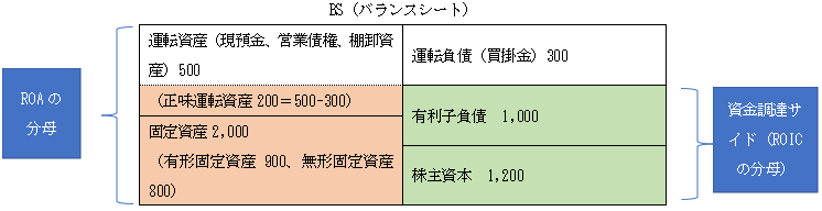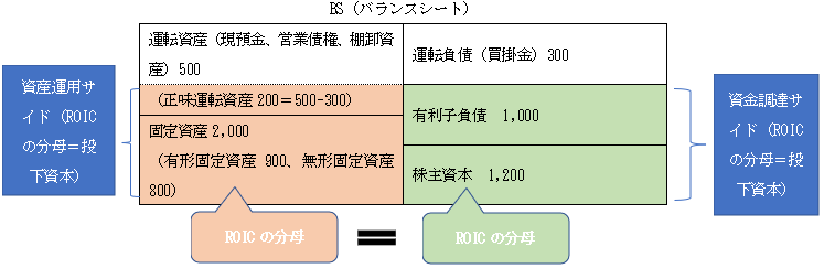 ROICの特徴として、分母となる投下資本は「資金調達サイド」および「資産運用サイド」の両面から見ることができるという“二面性”が挙げられる。下記の簡潔なBS(バランスシート=貸借対照表)を使って説明すると、投下資本は「資金調達サイド」(BSの右側)から見れば、「有利子負債1,000+株主資本1,200=2,200」と説明できる。一方、「資産運用サイド」から見れば、「正味運転資産200(運転資産500-運転負債300)+固定資産2,000=2,200」と説明できる。