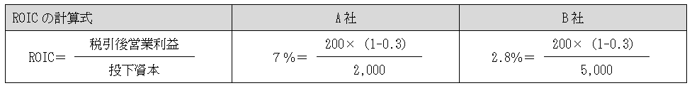 A社とB社は売上高、営業利益がともに同額であるため、損益計算書だけ見ていると、両社は同等と評価されることになる。ところが、資本効率という視点で見ると評価は変わってくる。A社の投下した資本が2,000であるのに対し、B社の投下した資本は5,000であり、B社の投資額はA社の倍以上となっている。つまり、資本効率という点から見るとA社の方が優れた会社ということになる。ROICを簡便的に計算すると下表のとおり。