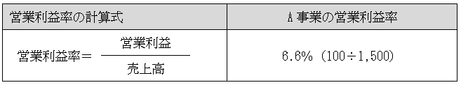こうした評価の相違は事業単位でも生じ得る。各事業のKPIを営業利益率としている会社を考えてみよう。例えば営業利益率10%を目標としている会社においてA事業の売上高が1,500、営業利益が100の場合、A事業の営業利益率は下表のとおりとなる。