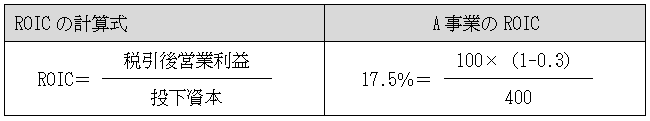 このA事業を資本効率の観点から見てみると、例えばA事業への投下資本が400、投資家の要求利回りである資本コストが10%と仮定すれば、ROICは下表のとおりとなる。