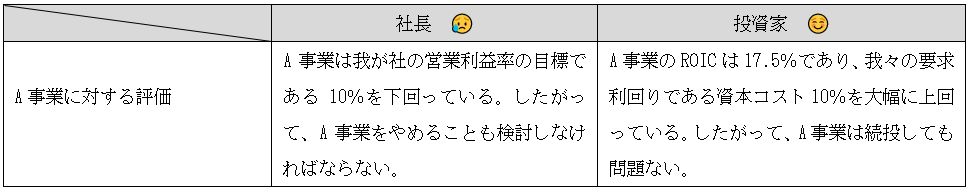 以上を踏まえると、A事業に対する評価は、社長と投資家では以下のとおり異なるものとなる。