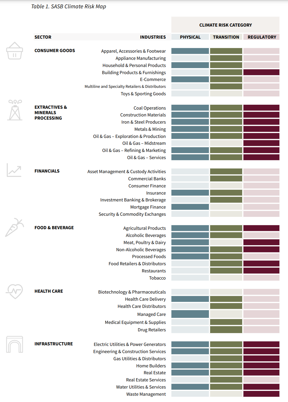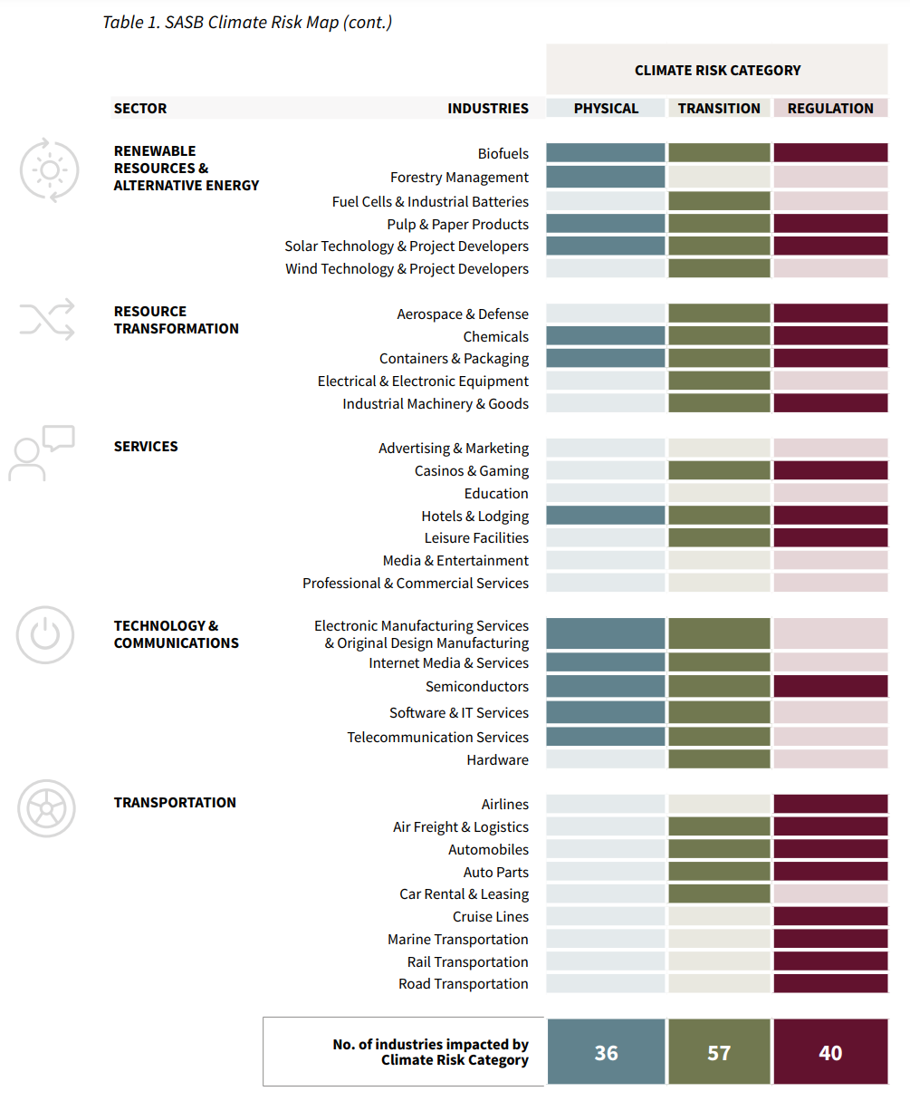 米国SASB(サステナビリティ会計基準審議会、現在はIIRCと統合し、VRF(バリューレポーティング財団)は投資家向けに業種別のサステナビリティ開示基準を策定するとともに、この基準を用いて、77の業種別に、重要性の高い「移行リスク」「物理的リスク」「規制リスク」があるか否かを判定した分析資料を公表しています。