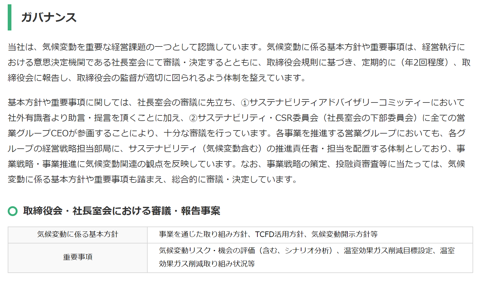 ●取締役会及び/または委員会が、戦略、主な行動計画、リスク管理政策、年度予算、事業計画をレビューし指導する際、また当該組織のパフォーマンス目標を設定する際、及び実行やパフォーマンスをモニターする際、さらに主な資本支出、買収、資産譲渡を監督する際、気候関連問題を考慮している