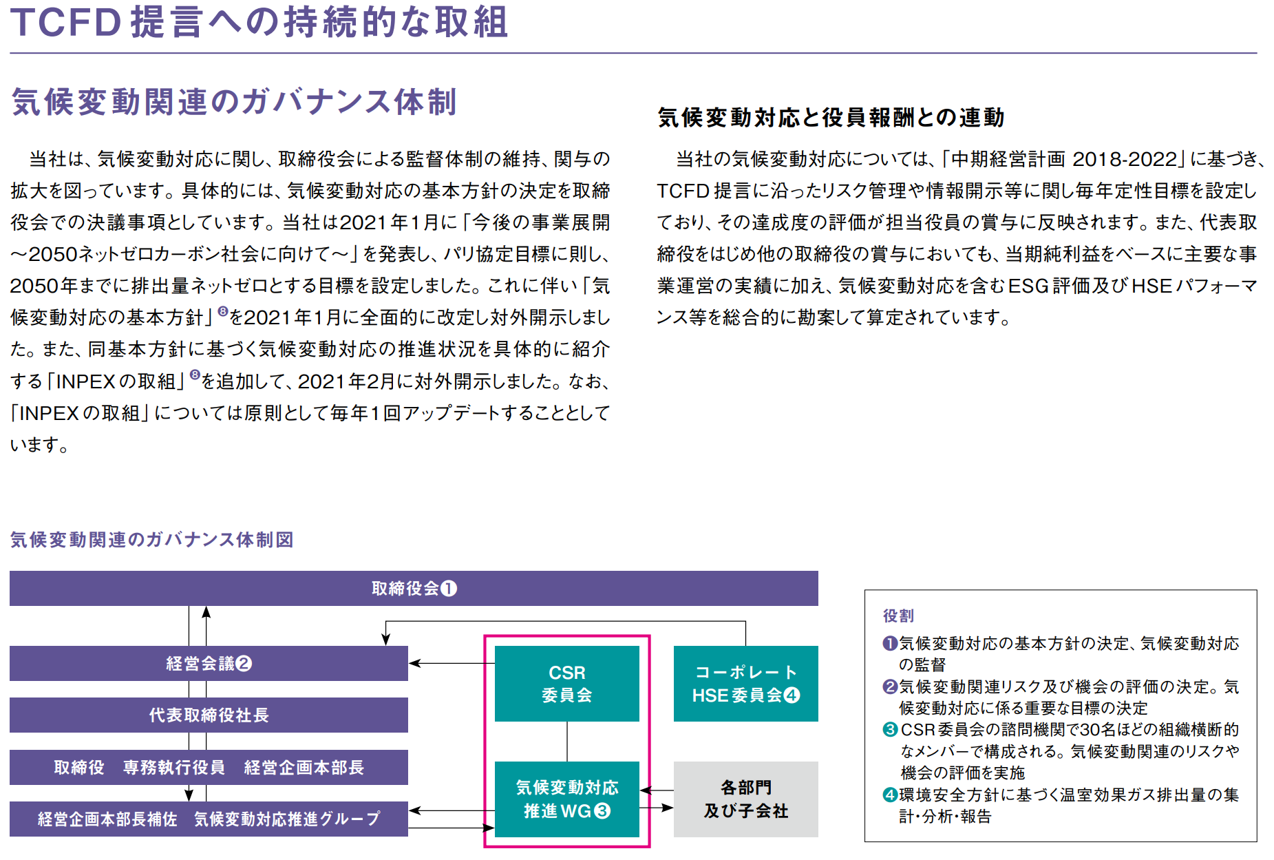 また、INPEXは、ガバナンス体制図を用いて、取締役会の関与や各会議体の役割、役員報酬との連動について説明しています。