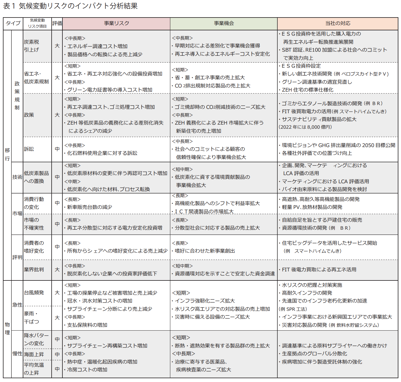 積水ハウスは、気候変動の影響の分析結果として、リスク・機会のタイプ別に影響と対応策を説明しています。このように一覧表で開示する事例も多くの企業で見受けられます。