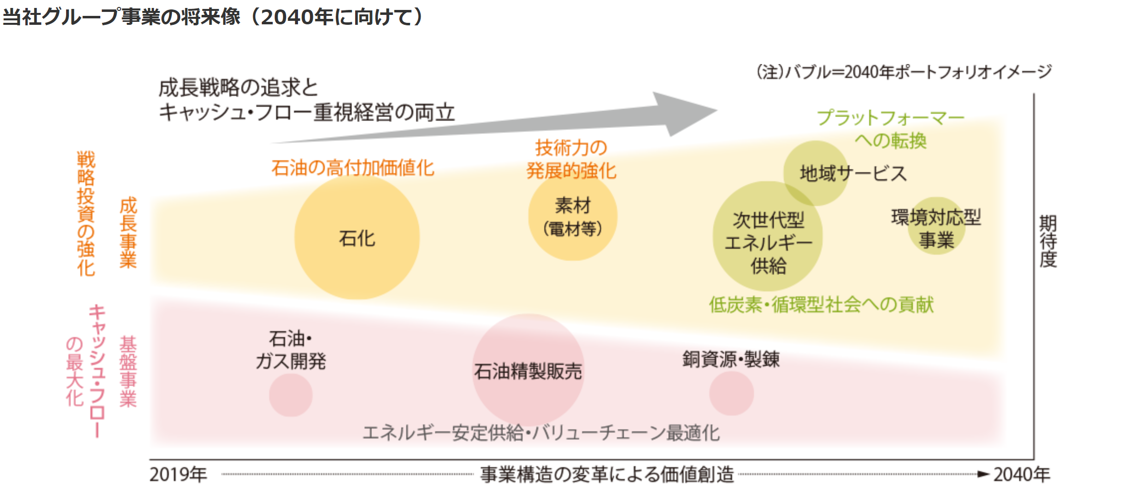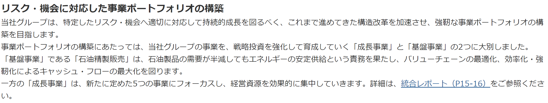 ENEOSホールディングスは2040年までの事業ポートフォリオの変化のイメージを開示しており、中期経営計期間中の戦略投資額も示しています。エネルギー業界のように事業そのものの存続が危ぶまれる業界に属する企業にとって、リスク・機会を踏まえた会社の将来像を開示することは極めて有用と言えるでしょう。