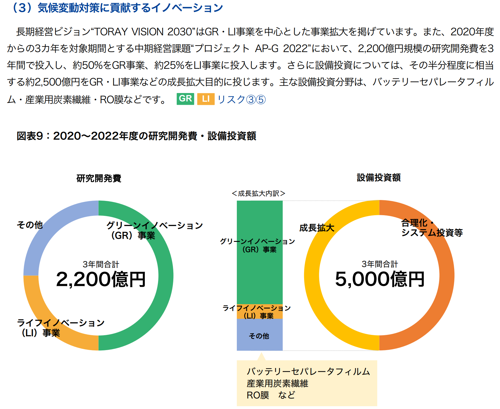 東レは、再生可能エネルギー関連事業等を事業機会の事例として開示、イノベーションに向けた研究開発費と設備投資額を事業別に示しています。気候変動は「リスク」にフォーカスして語られることが多くなっていますが、化学業界のように事業機会が多い業界に属する企業は事業機会を手厚く説明することも選択肢となります。